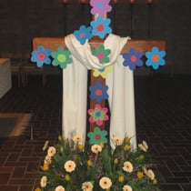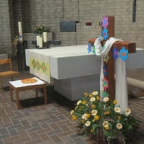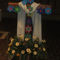 Am Karfreitag Morgen um 10.00 Uhr versammelten sich die 12 Erstkommunikanten mit ihren Eltern, Geschwistern, Verwandten und einigen Pfarreiangehörigen zur Kreuzfeier: „Mit Jesus gehen wir den Kreuzweg“. Als Zeichen für usneren Glauben an die Auferstehung und unsere Hoffnung über den Tod hinaus, haben die Erstkommunikanten das Kreuz mit selbstgemalten Blumen geschmückt, ein eindrückliches, tiefgehendes Zeichen ihrer Liebe zum gekreuzigten Heiland. Als Andenken konnte jedes Kind ein geweihtes Kreuz mit dem Erstkommunionsymbol: Rad – Jesus ist unsere Mitte mit nach Hause nehmen.