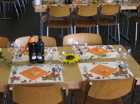 Die schön gedeckten Tische und der Blumenschmuck – Sonnenblumen und Efeu- waren für das Auge ein Blickfang. Die Teilnehmenden wurden persönlich begrüsst und willkommen geheissen.